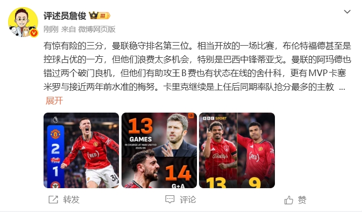 04月28日讯 曼联本轮2-1击败布伦特福德,赛后,评述员詹俊发文。